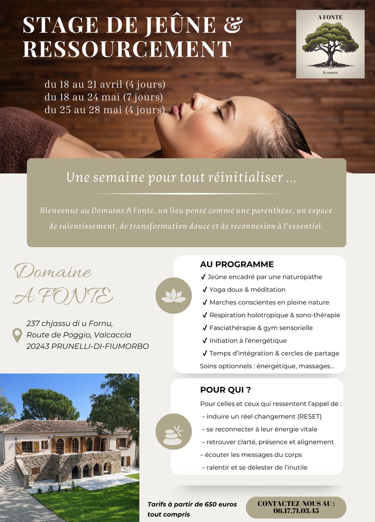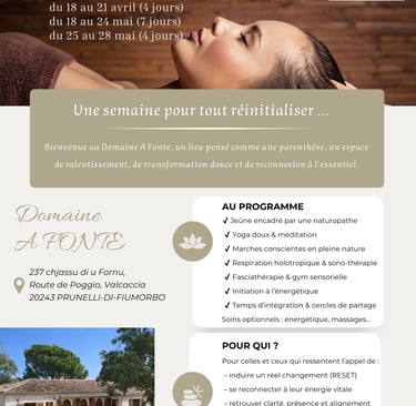 Dans un cadre naturel préservé, entre mer et montagne, le domaine accueille des séjours de jeûne encadrés, des retraites de méditation et de yoga, des conférences thérapeutiques, ainsi que des immersions dédiées au développement personnel.
